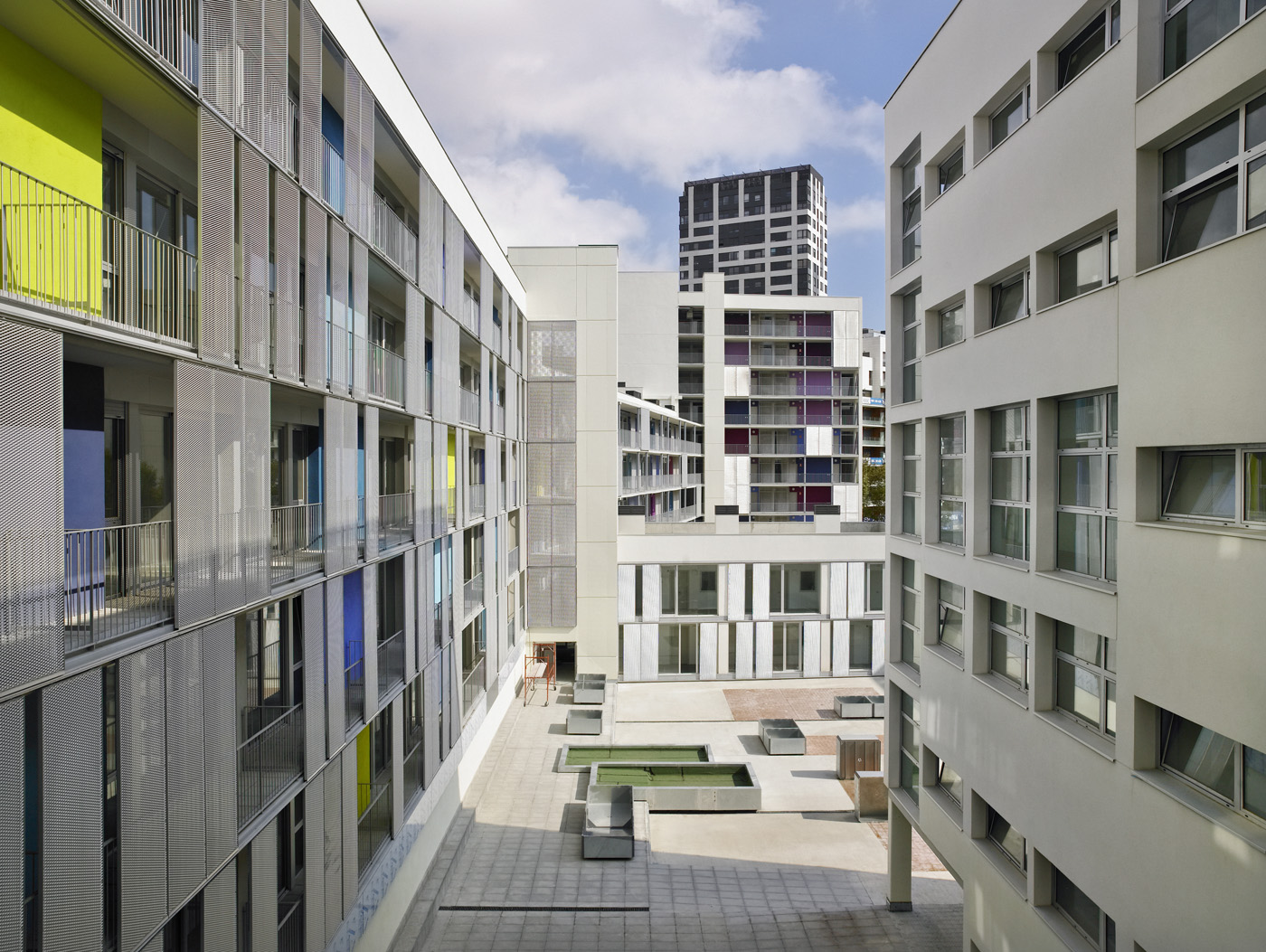 L’impianto proposto configura due paesaggi distinti: un patio maggiormente urbano, delimitato al pian terreno da un edificio di servizio pubblico per il quartiere, al quale si aprono le residenze per i giovani, e un giardino per gli anziani, accessibile dalla strada e dallo spazio pubblico contiguo. L’edificio si chiude rispetto alla strada con una facciata poco perforata e di piccole aperture, e si apre all’interno del patio con una facciata vetrata più complessa, con differenti strati che rendono possibile da un lato, l’unità del complesso residenziale e, dall’altro, la differenziazione tra i diversi tipi di alloggi, blocchi e orientazioni.