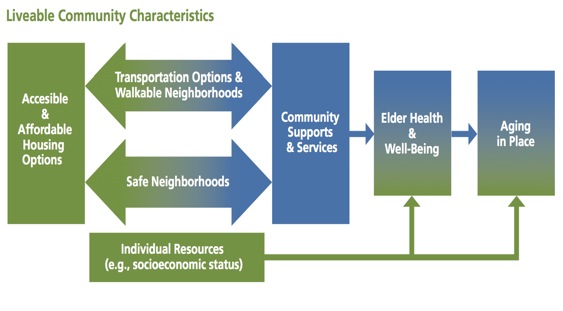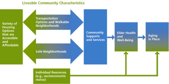 Gli indicatori evidenziati riflettono un quadro di come alcune caratteristiche possono rendere le comunità vivibili influenzando l’invecchiamento in casa e permettono di affermare che una comunità vivibile offre innanzitutto una varietà di aspetti della propria accessibilità, opzioni di alloggi a prezzi accessibili e visitabili in modo che tutti gli anziani abbiano un posto dove vivere bene. In effetti una comunità è vivibile se ha le caratteristiche che favoriscono l’accessibilità per l’intera comunità, tra cui: quartieri sicuri e raggiungibili a piedi, diverse opzioni di trasporto per garantire la mobilità a tutte le età e condizioni, condizioni di guida sicura per tutti, pianificazione e misure utili ad affrontare le emergenze ; una comunità vivibile fornisce una vasta gamma di servizi di supporto e opportunità di partecipazione alla vita della comunità: assistenza sanitaria, servizi generali, generi di vendita al dettaglio e altri servizi generici , rifornimento di cibo , integrazione sociale.