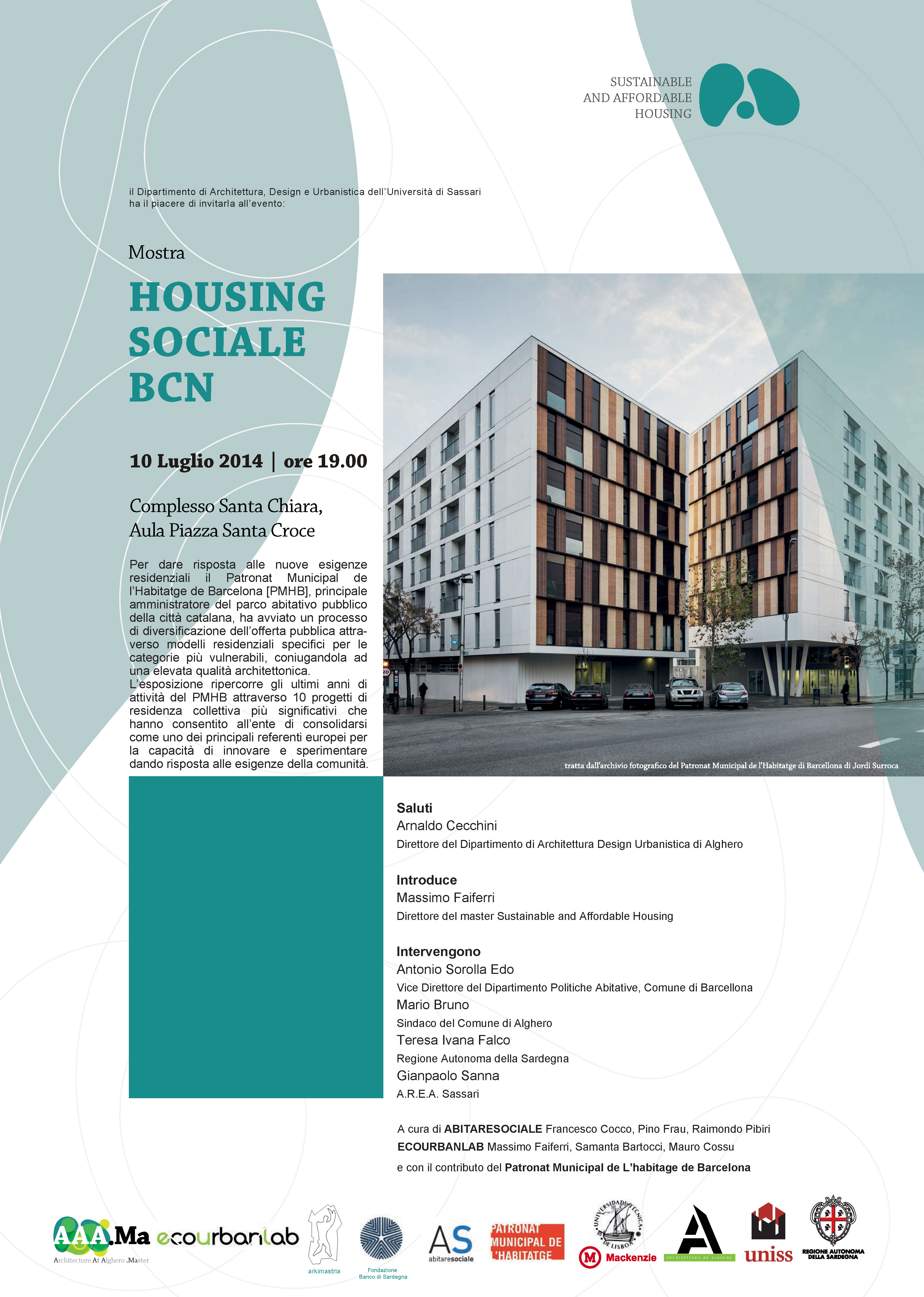 Il 10 Luglio 2014 alle ore 19,00 presso il Complesso Santa Chiara, Aula Piazza Santa Croce inaugura HOUSING SOCIALE BARCELLONA mostra a cura di Abitaresociale di Francesco Cocco, Pino Frau, Raimondo Pibiri e Ecourbanlab di Massimo Faiferri e Samanta Bartocci, e il contributo del Patronat Municipal de l’Habitatge de Barcelona [PMHB].