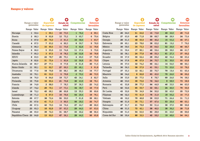 L’Italia, nella classifica generale dei 96 paesi esaminati, si posiziona al 39° posto dopo molti paesi europei, alcuni dei quali anche dell’est europeo, e di alcuni paesi dell’America Latina. Gli anziani italiani sono al 25° posto per reddito e al 6° posto come stato di salute dopo Giappone, Svezia, Spagna, Canada e Australia. Sono invece nelle ultimi posizioni per quanto riguarda competenze ( 69° posto) e ambienti favorevoli ( 74° posto).