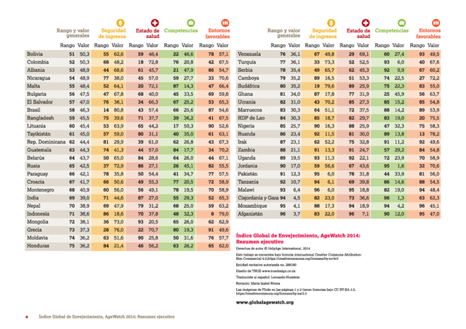 L’invecchiamento è un fenomeno che riguarda tutta la popolazione mondiale, ciò nonostante in Europa non si invecchia nello stesso modo che nel resto del mondo. Invecchiare in un paese ricco, con una democrazia consolidata, un sistema sanitario efficiente e un sistema culturale moderno, è differente che farlo in un luogo dove le stesse condizioni non si verificano. Ce lo dice il report Agewatch 2014 (Índice Globale dell’invecchiamento) realizzato da Helpage, (www.globalagewatch.org), che cerca di rappresentare in maniera obiettiva la situazione del benessere economico e sociale degli anziani in tutto il mondo attraverso alcuni indicatori: reddito, stato di salute, competenze ancora attive e ambiente favorevole. Il report riguarda 96 paesi ed ha interessato una percentuale di persone da 60 anni e oltre.